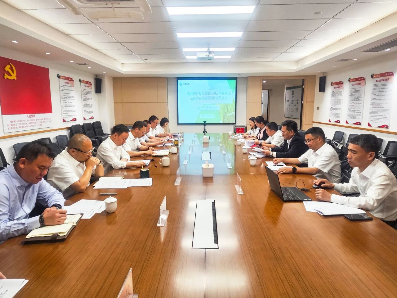 6月13日,農(nóng)業(yè)銀行云南省分行到訪云南農(nóng)擔公司開展業(yè)務推進座談,進一步落實雙方年初銀擔合作座談會議精神,總結上半年工作進展情況,謀劃推動下半年各項工作。農(nóng)業(yè)銀行云南省分行黨委委員盧偉,省公司總經(jīng)理李世偉,副總經(jīng)理廖寅皓、梁威出席會議。農(nóng)業(yè)銀行云南省分行鄉(xiāng)村振興金融部、普惠金融事業(yè)部、農(nóng)戶金融部及省農(nóng)擔公司業(yè)務發(fā)展部、風險控制部、資產(chǎn)保全與法律事務部、戰(zhàn)略發(fā)展部負責人參加會議。